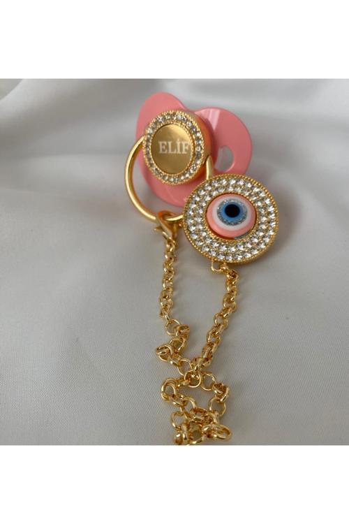 Nazar Boncuklu Emzik Seti – Altın Kaplama Zirkon Taşlı Emzik Zinciri Bebek Hediyelik