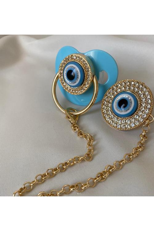Nazar Boncuklu Emzik Seti – Altın Kaplama Zirkon Taşlı Emzik Zinciri Bebek Hediyelik