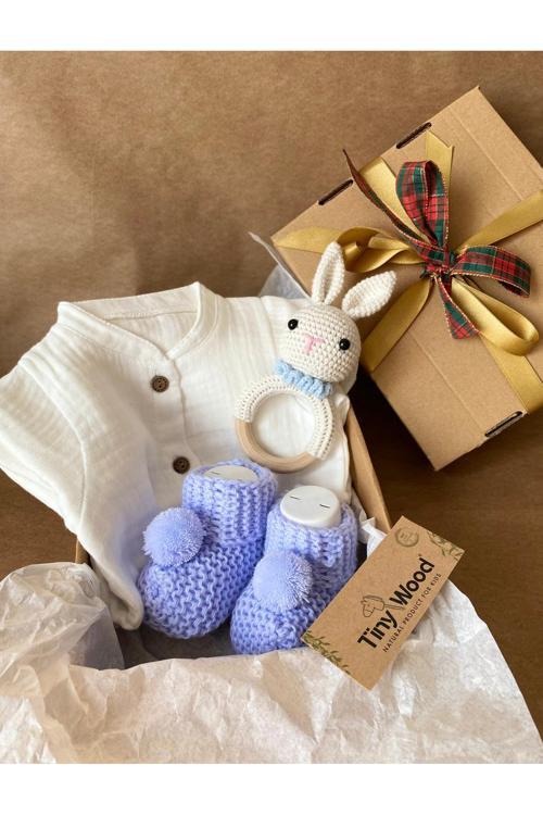Tiny Wood Organik Yenidoğan Bebek Hediye Seti | Amigurumi Tavşan Çıngırak, Müslin Tulum & Triko Patik