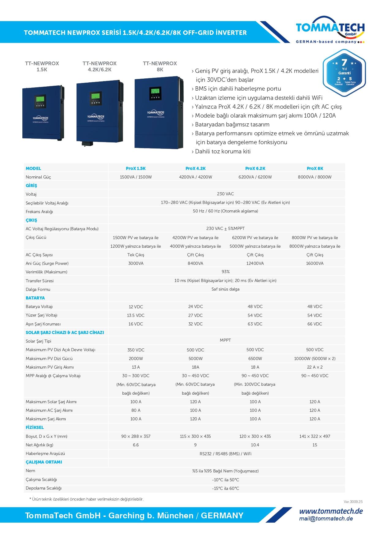 TommaTech C ProX Serisi monofaze off-grid inverterler; bağımsız enerji sistemlerinde yüksek uyumluluk, akıllı kontrol ve esnek kurulum ihtiyacına göre geliştirilmiştir. Tam sinüs dalga çıkışı, bataryadan bağımsız çalışma opsiyonu ve yüksek şarj kapasitesi ile konut, villa, bağ evi ve işletme uygulamalarında stabil ve verimli enerji yönetimi sağlar. ProX 8.0K modeli; geniş MPPT çalışma aralığı, çift PV giriş yapısı ve entegre WiFi izleme altyapısı ile performans ve kontrolü tek platformda toplar.