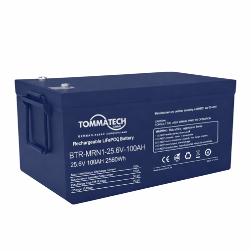 TommaTech Marine ABS Kasa 25.6V 100Ah LiFePO4 Lityum Batarya, denizcilik uygulamaları, karavan sistemleri, off-grid enerji depolama çözümleri, güneş enerjisi sistemleri ve profesyonel enerji depolama ihtiyaçları için geliştirilmiş yüksek performanslı bir enerji depolama çözümüdür. Uzun ömürlü prizmatik LiFePO4 hücre teknolojisi sayesinde geleneksel kurşun asit akülere kıyasla daha yüksek güvenlik, daha uzun çevrim ömrü ve üstün verim sunar.