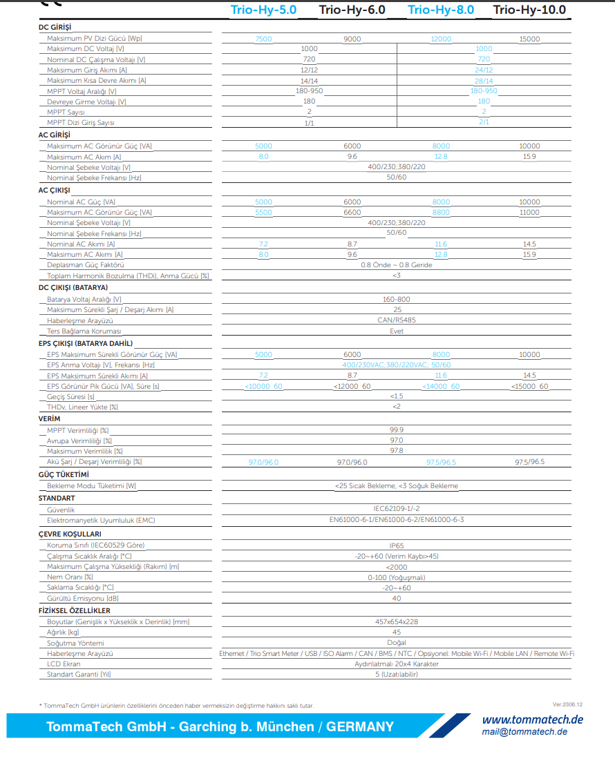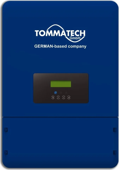 Yeni nesil TommaTech Trio-Hybrid üç fazlı inverter serisi hem konutsal hem de ticari uygulamalar için esnek ve rahatlıkla uygulanabilir çözümler sunmakta. 3kW ve 10 kW arasında 4 adet güç seçeneğine sahip üç fazlı olarak sunulan model 180V ila 950V arasındaki geniş MPPT voltaj aralığıyla maksimum 97.8%’lik yüksek verimlilik sağlayarak en üst düzeyde güneş enerjisi üretimini mümkün hale getirmekte. Ayrıca ticari uygulamalar için birden fazla inverterin paralel olarak bağlanması ile birlikte sisteme uygun depolama seçenekleriyle daha fazla güç çıkışı elde edilebilen kompakt sistemler de oluşturulabilmekte. Ek olarak inverterlerde uzaktan izleme amacıyla Wi-Fi seçeneği de mevcuttur.