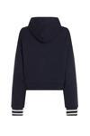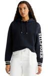 Bu organik pamuklu kapüşonlu üst, kısa kesimlidir ve nervürlü örme manşetlerde çizgili detaylara ve kolda kalın bir Hilfiger monotype baskısına sahiptir.