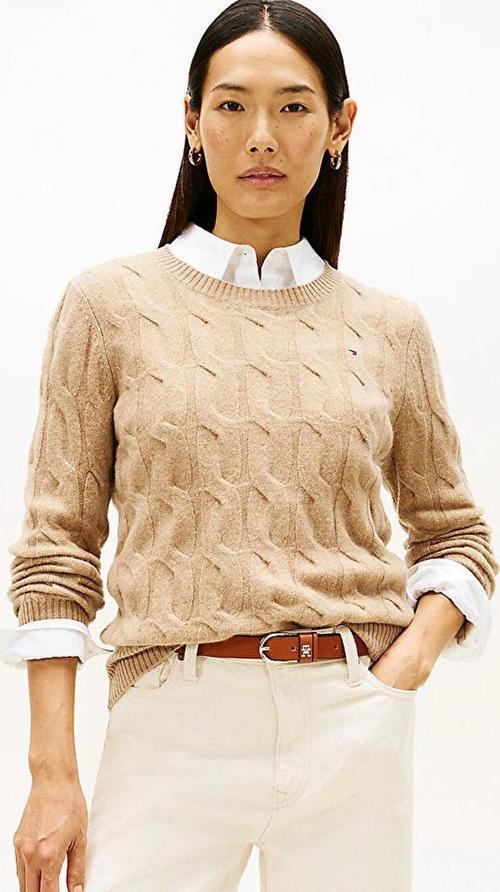 Tommy Hilfiger Yumuşak Yün Saç Örgülü Bisiklet Yaka Uzun Kollu Kadın Bej Kazak WW0WW43586ADM