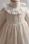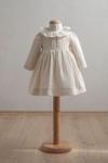 Bu zarif kız bebek elbisesi, ekru renginin sakinliği ve dantel detaylarının şıklığıyla göz dolduruyor.