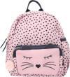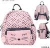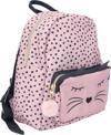 Ürün bilgisi "Prenses Mimi sırt çantalı kedi" Miyav: Kedi yüzü işlemeli ve sevimli puantiyeli tasarıma sahip pembe renkli sırt çantası, bir ana bölmeye ve fermuarlı bir ön cebe, dışarıda bir içecek şişesi için ekstra bölmeye ve diğer ayrı iç bölmelere sahiptir