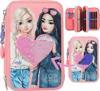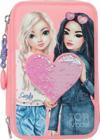 - Elinizi kalbinizin üzerine koyun! Çift model motifli, ışıltılı pembe TOP Model üçlü kalem kutusu, ön tarafında pembe ve mor tonlarında ışıltılar saçan ters çevrilebilir pullardan yapılmış büyük bir kalbe sahiptir.