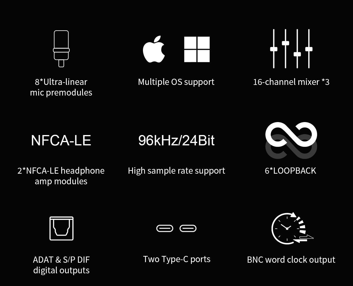 Kapsamlı E8x8 PRE ses arabirimi, adından da anlaşılacağı gibi, iki USB bağlantı noktası, iki kulaklık çıkışı ve iki optik çıkış ile tamamlanan 8 analog giriş ve 8 analog çıkış sunar. Arayüz 8 ultra-lineer mikrofon preamplifikatör modülü, iki NFCA-LE kulaklık amplifikatörü içerir ve 24bit 96kHz'e kadar örnekleme hızlarını destekler.