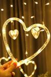 Şeffaf Kalp şeklinde Perde Led Işık 138 Ledli; Işık rengi günışığı; 2; 5 metre eninde, 90 cm büyük kalpli kablonun uzunluğu,60 cm küçük kalpli kablonun uzunluğu; 16*17cm büyük kalp ölçüleri , 8,5*8 cm küçük kalp ölçüleri; 6 Büyük kalp, 6 küçük kalp dekordan oluşur; Fişle çalışır, 8 farklı animasyon modu vardır; İç mekan kullanımına uygundur;