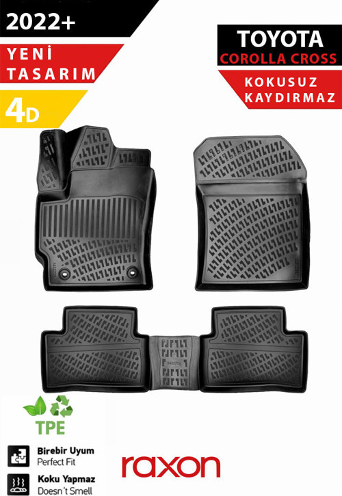 Toyota Corolla Cross 2022 ve üzeri modeller için özel olarak üretilen Plus Serisi 4D siyah paspas seti, aracınızın zeminini dört mevsim boyunca maksimum koruma altına alır. 4D özel kalıp tasarımı, araç taban ölçülerine birebir uyum sağlayarak boşluk bırakmadan zemini tamamen sarar.