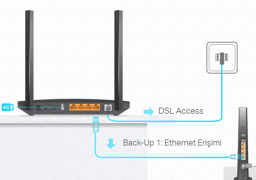Yedek olarak LAN / WAN bağlantı noktası, Archer VR400'ün Ethernet kablosu aracılığıyla kablo ve fiber modemlerden gelen bağlantıları kabul etmesine izin verir. Ek olarak, USB bağlantı noktası 3G / 4G dongle bağlantılarını destekler.