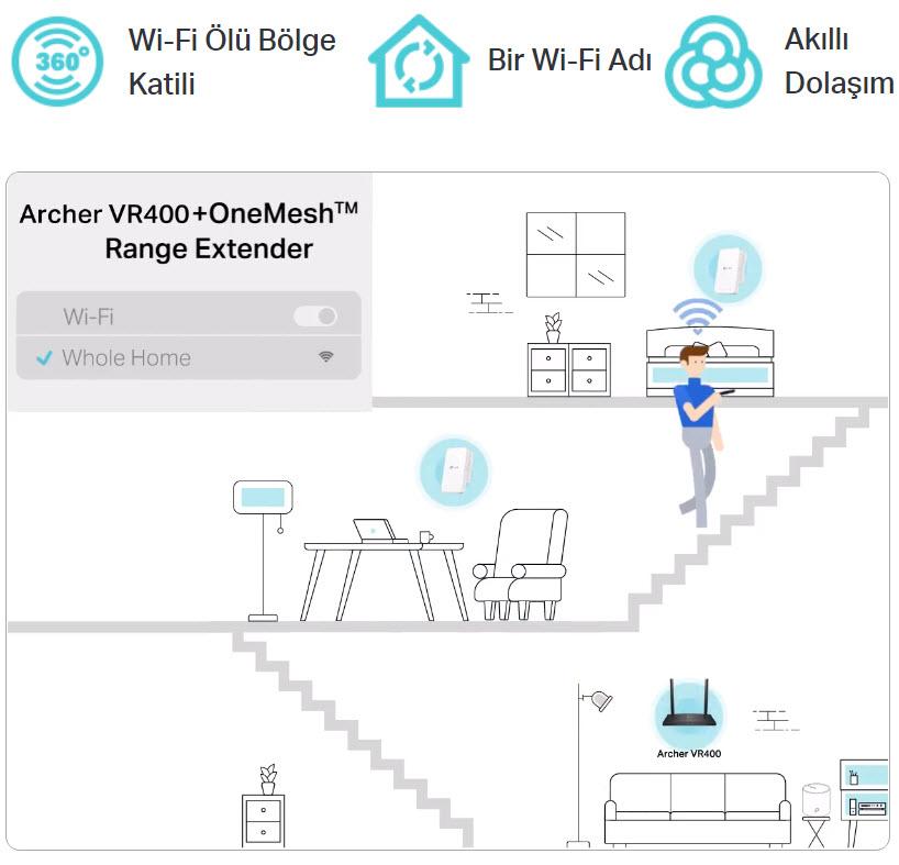 OneMesh™ , tüm evi kesintisiz kapsama alanı için tek bir WiFi adıyla bir Mesh ağı oluşturmanın basit bir yoludur. Bir OneMeshTM menzil genişleticiyi bir OneMesh ™ yönlendiriciye bağlamanız yeterlidir. Artık istikrarlı bir bağlantı aramak yok.