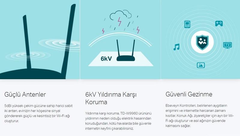 ![]() Sper Hızlı VDSL Modem Ynlendirici VDSL2 teknolojisi, hem yukarı hem aşağı ynde eş zamanlı olarak 100 Mb/s’ye kadar ıkabilen VDSL geniş bant hızları sağlar. Btnleşik DSL bağlantı kapısı, bağımsız yazılım satıcılarının oğuyla uyumluluk sağlamak iin tm standart DSL bağlantılarını* destekler. .*TD-W9960 rn; VDSL2, ADSL2+, ADSL2 ve ADSL ile uyumludur. ![]() 300 Mbps'ye Kadar Hızlı WiFi 2.4 GHz bandı ve 4 Megabit LAN bağlantı noktaları zerinde 300 Mb/s kablosuz hat hızı sayesinde TD-W9960 rn, yksek znrlkl yayın, internette oyun ve bant genişliğinin yoğun kullanıldığı diğer uygulamalar iin idealdir. ![]() Kolay Kurulum ve Ynetim Kullanımı kolay web arabirimi ve gl Tether uygulaması sayesinde TD-W9960’ı birka dakikada kurun. Ebeveyn Kontrol ve Erişim Denetimi gibi ağ ayarlarını her trl Android veya iOS aygıtından ynetin. Ev ağınızı istediğiniz anda ve istediğiniz yerden kontrol edin. ![]() ![]()