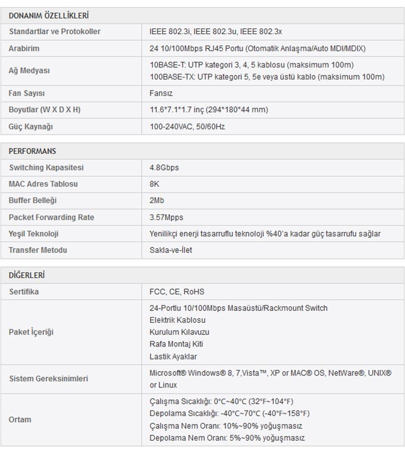 Bu rn Ne Yapar?TL-SF1024D Fast Ethernet Switch, eski ağı 1000Mbps ağa upgrade etmek iin, yksek performanslı, ucuz, kullanımı kolay, kesintisiz ve standart bir upgrade sağlar. 24 portun hepsi otomatik MDI/MDIX’i destekler, kablo tipi iin endişeye gerek yok, sadece takın ve alıştırın. Dahası, yeniliki enerji tasarruflu teknoloji ile TL-SF1024D, harcanan gte %75’e* kadar tasarruf sağlayabilir ve paketleme malzemesinin %80’i dnştrlebilir, bu da onu iş ağınız iin evre dostu bir zm yapar.Yksek PerformansGvenli ve onaylı bir dahili g kaynağı ile birlikte metal kasa tasarımı, Switch’i, 24 kullanıcılı ortamlardan daha kk ortamlar iin olduka ucuz olan ok gl bir rn yapıyor. Non-blocking anahtarlama mimarisine sahip olan TL-SF1024D, maksimum throughput iin tam kablo hızında paketleri iletir ve filtreler. Full Duplex mod iin IEEE 802.3x flow control ve Half Duplex mod iin karşı basın, trafik tıkanıklığını giderir ve TL-SF1024D’yi daha gvenli alışır hale getirir.TP-LINK Yeşil TeknolojisiBu yeni nesil TL-SF1024D Fast Ethernet Switch, ağ kapasitenizi ok daha az g ile olduka genişletebilen yeniliki son enerji tasarrufu teknolojilerine sahiptir. Ağınızın yaydığı karbonu sınırlamak iin, link durumuna ve kablo uzunluğuna gre g harcamasını otomatik olarak ayarlar. AB’nin RoHS’i ile de uyumludur, bylece belirli tehlikeli maddelerin kullanımı nlenmiştir. Ayrıca paketleme malzemesinin %70’i dnştrlebilir.