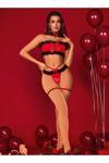 Tutkunun rengi kırmızı, gizemin rengi siyahla buluşuyor! Transparan kumaşın cesur dokusunu bacak bant detaylarıyla taçlandıran bu takım, etkileyici bir siluet ve baştan çıkarıcı bir görünüm sunar.
