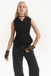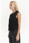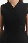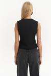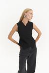 V kesim, kolsuz, asimetrik kesim yelek. Önü aynı renkte düğmelerle kapamalı. Astarlı.