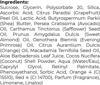 Doğal Yağlar: Avokado Yağı, Macadamia Yağı, Tatlı Portakal Yağı, Tatlı Badem Yağı, Çuha Çiçeği Yağı, Aspir Yağı, kuruluğu önlemeye yardımcı olmak için cildi besler ve rafine, ışıltı için nemi dengeler.
