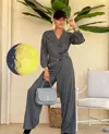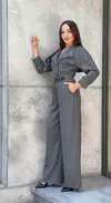 Simli çizgiler ve asimetrik yaka ile öne çıkan bu truvakar kollu tulum, gardırobunuzun favorisi olacak. Uzun ömürlü kullanım için yıkama talimatlarına uyun.