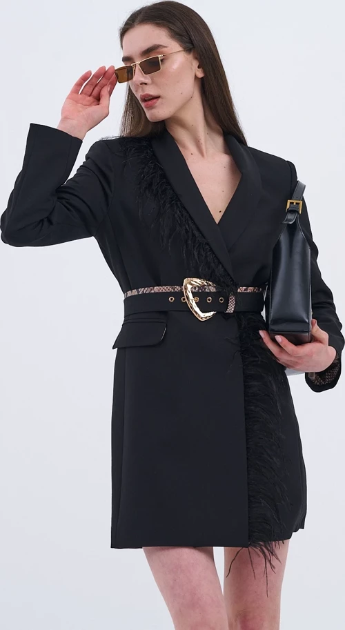 - tüylü ceket elbise modelimizle zarafet ve şıklığı yeniden keşfedin! Omuzdan aşağıya doğru inen zarif tüy detayları ve beldeki büyük tokalı kemeri ile bu ceket elbise, her ortamda fark edilmenizi sağlayacak.