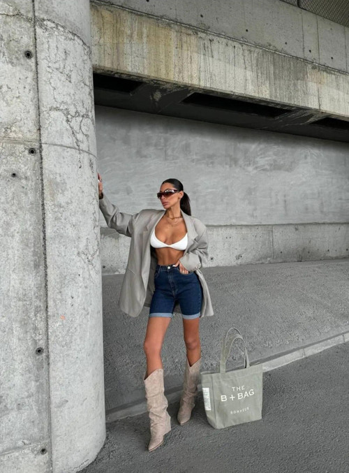 Yüksek bel kesimi vücut hatlarını zarifçe sararak feminen bir siluet oluştururken, kısa boyu hareket özgürlüğü tanır.