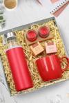 Trendmiya Deri Kılıflı 500Ml Kırmızı Su Matarası & Kırmızı Kupa & 2'Li Mum & Teashop Bitki Çayı Hediye Seti