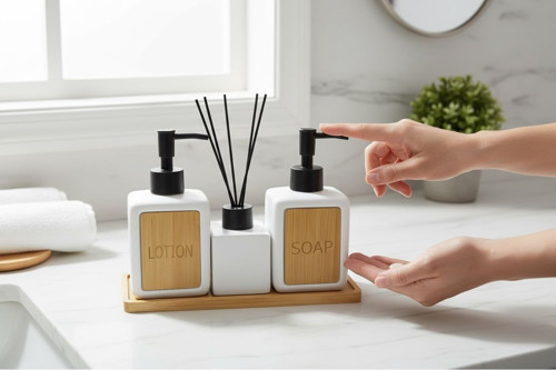 Bounies banyo seti takımı - sıvı sabunluk seti bambu altlıklı