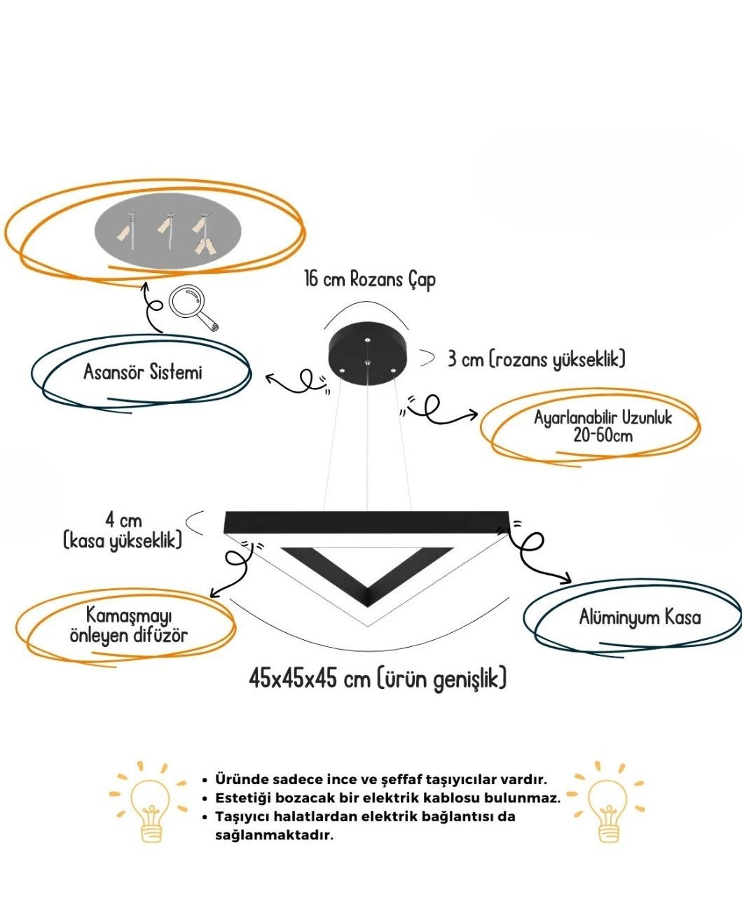 Gn gen aydınlatma Trıan ( Siyah Kasa, Gün Işığı ) Ledli Modern Led Avize, Salon, Mutfak, Antre, Hol, Masa, Sarkıt