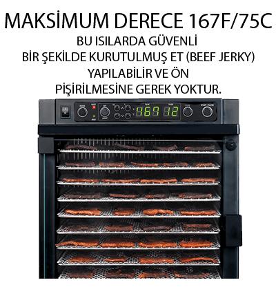 25-75 C arasında ayarlanabilen iç ısıNormal kurutucularda kurutulmuş et (beef jerky) yapılmak istendiğinde makinenin düşük ısısından dolayı etin ön pişirilmesi gerekilir. Halbuki Sedona Express’in 75C’ye kadar çıkan ısısı sayesinde etlerinizi direk olarak kurutabilirsiniz. Amerikan Gıda güvenliğinden sorumlu bakanlığının beef jerk yapımı ile ilgili alınması gereken güvenlik önlemleri ile ilgili Ingilizce makalesine buradan ulaşabilirsiniz.