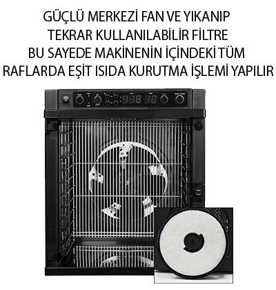 Merkezi tek ve güçlü fan teknolojisi sayesinde haznenin iç ısısı dijital panelde ayarlanan ısıda sabit bir şekilde kalır. Haznenin içerisindeki her alan eşit bir şekilde ısınır. Arkada bulunan yıkanabilir ve tekrar kullanılabilir filtre sayesinde ortamda havada uçuşan istenmeyen toz ve kıllar makinenin içerisine girmez.