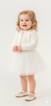 Şıklığı ve zarafeti bir arada sunan triko bolerolu kız bebek elbise modeli, minik prenseslerin özel günlerde parlaması için tasarlandı. Ekru renk elbisesi ve simli bolerosu ve renkli tütüsü ile zarif bir bütünlük oluşturan bu model, hem klasik hem modern bir görünüm sunar.