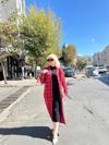 Triko Hırka Elbise İkili Takım, feminen ve şık bir görünüm sunar. KırmızıSiyah renk kombinasyonuyla dikkat çeker.