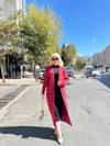 Triko Hırka Elbise İkili Takım, feminen ve şık bir görünüm sunar. KırmızıSiyah renk kombinasyonuyla dikkat çeker.