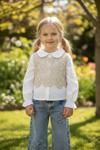 Üst kısımda yer alan beyaz yakalı uzun kollu gömlek, üzerine eklenmiş dantel detaylı bej örgü süveter ile romantik bir hava yaratıyor.