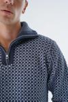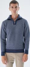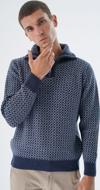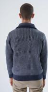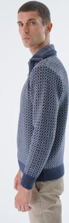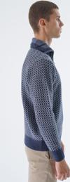 Jakarlı deseniyle göz alıcı bir görünüm sunan lacivert kazak, şıklığınızı tamamlayacak