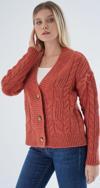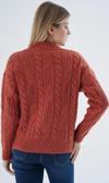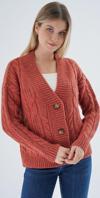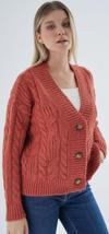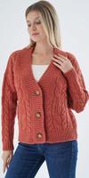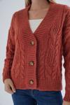 Trist Star Kadın Kiremit Oversize V Yaka Saç Örgülü Ajurlu Düğmeli Yün Karışımlı Triko Örme Uzun Hırka