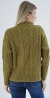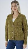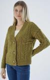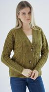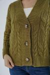 Trist Star Kadın Olive Oversize V Yaka Saç Örgülü Ajurlu Düğmeli Yün Karışımlı Triko Örme Uzun Hırka