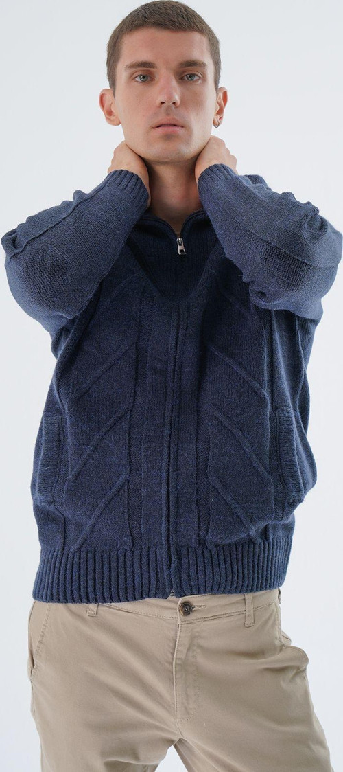 Günlük kullanım için ideal, rahat ve şık bir seçim olan lacivert büyük beden erkek kamyon yaka yürütme örgülü fermuarlı cepli yün triko hırka, her ortamda konforlu bir stil sunar