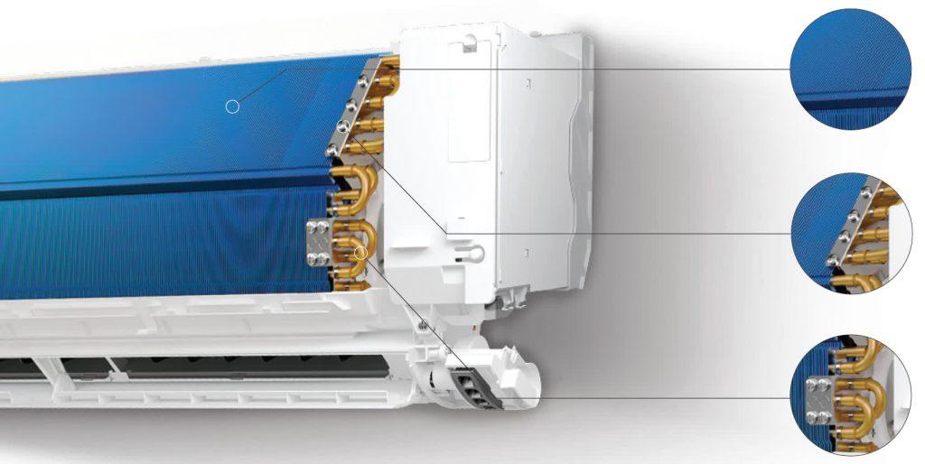 Havanın nem, tuz, kimyasallar ve asit bakımından yüksek olduğu kıyı bölgelerindeki zorlu ortamın neden olduğu zararlardan klimayı korur, güvenilirliği ve klima performansını artırır.
