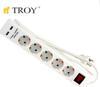 TROY 24025 USB Girişli Beşli Grup Priz ve Uzatma Kablosu ? Beşli anahtarlı kablolu USB grup priz ve uzatma kablosu? Topraklı, çocuk korumalı? 2 USB şarj girişi 5V, 1000mA? 1,4m uzatma kablosu