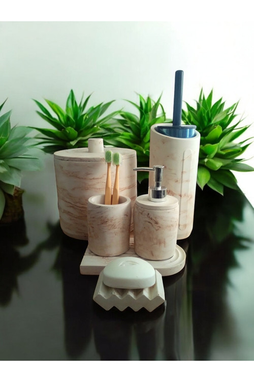 Mermer Serisi beton banyo seti 6 parça olarak diş fırçalık, sıvı sabunluk, katı sabunluk, mumluk,çöp kovası ve tuvalet fırçası olarak gelir