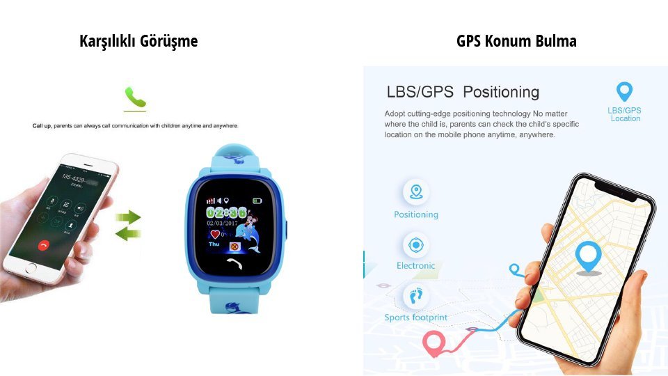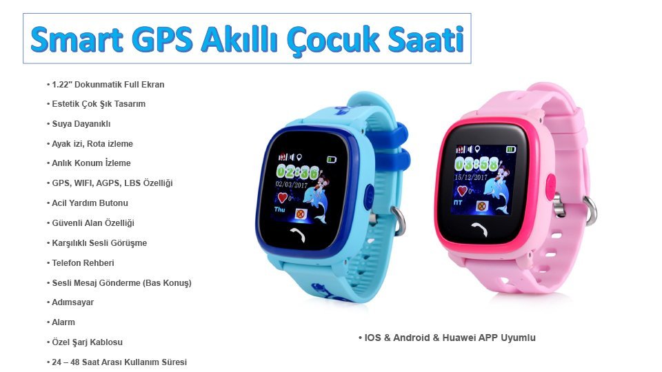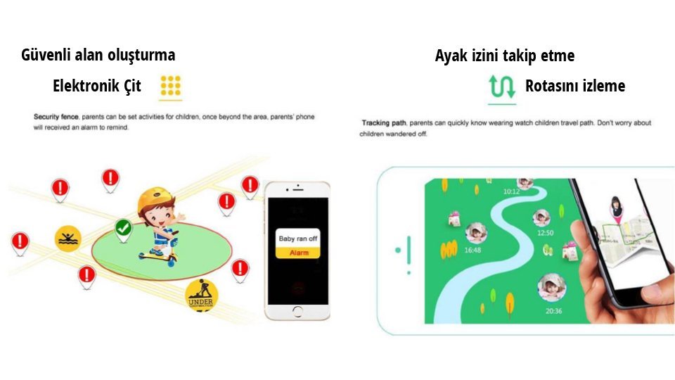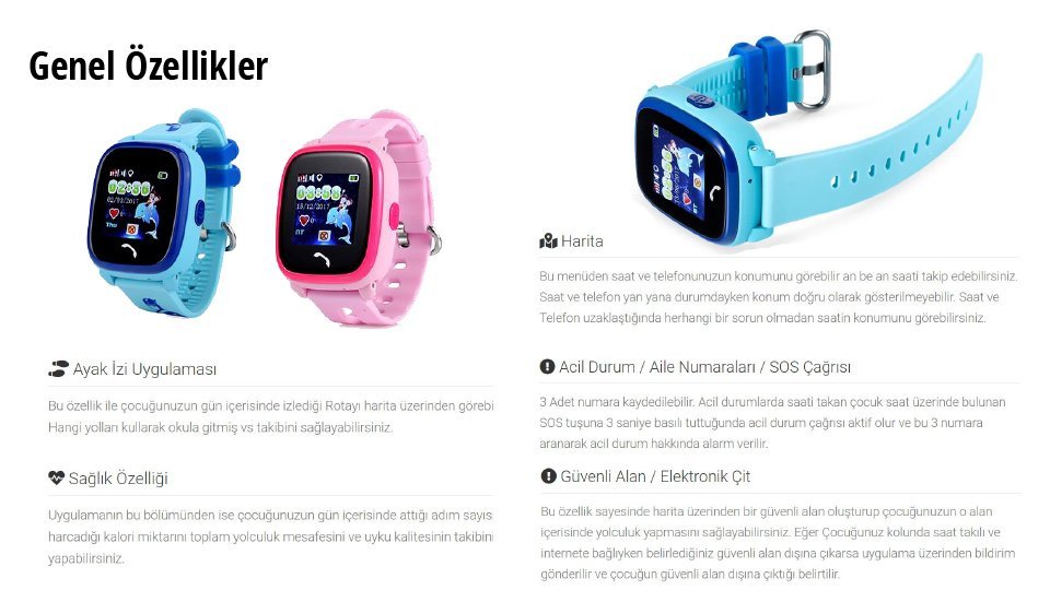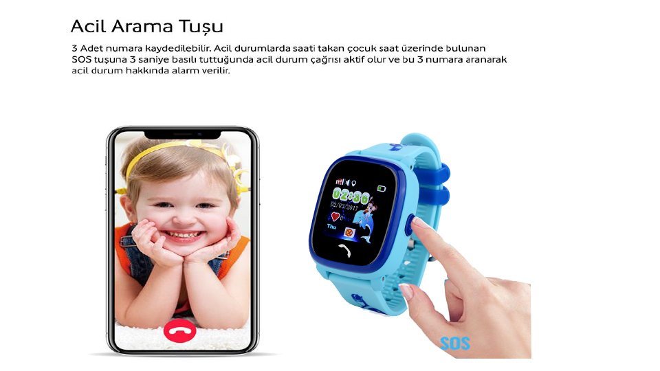 Tsmart GPS akıllı saat ile çocuğunuza dilediğiniz her zaman ulaşabilirsiniz. Sim kart ile çalışan Tsmart GPS Watch suya dayanıklılığa sahiptir Çocuğunuz elini yıkarken saati çıkarmasına gerek bulunmamaktadır Estetik ve Çok şık tasarıma sahiptir dokunmatik ekran, acil durum bildirimi, sesli görüşme, sesli mesaj, konum takibi ve güvenli alan oluşturma gibi özelliklere sahiptir. İOS ya da Android’li telefonunuza Setracker2 uygulamasını yükleyerek kullanabilirsiniz.