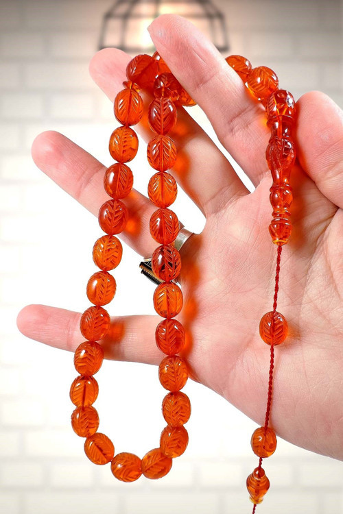 Yeni malzeme Ateş kehribar kullanılarak tesbihimiz özel işçilikli olarak işlenmiş olup cam gibi parlaktır tesbihimizin işçiliği yüksek kalitededir çekimi oldukça güzel ve keyiflidir, Tane parlatmaları keçeye vurularak en güzel şekilde parlatılmıştır, Tesbihlerde zamanla kullanıldıkça çekimi daha güzelleşir ve kiymetlenir..