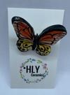 Canlı turuncu kanatları ve siyah detaylarıyla dikkat çeken bu el yapımı kelebek, doğanın özgür ruhunu taşır.
