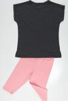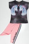 2 parça kız çocuk takım. Unicorn baskılı t-shirt ve pembe tayt.
