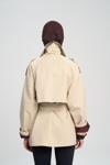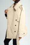Basen altı hafif bol kesim, ayarlanabilir kemerli, cepli, rüzgarlık detaylı trençkot.