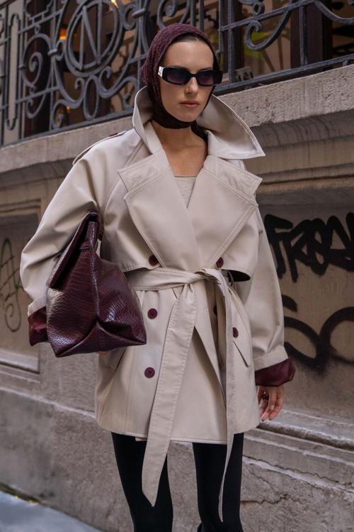 Basen altı hafif bol kesim, ayarlanabilir kemerli, cepli, rüzgarlık detaylı trençkot.