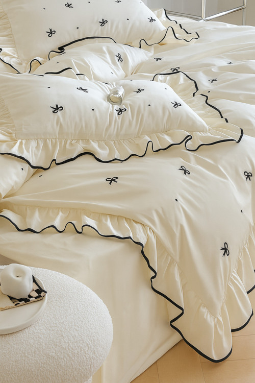 Soft Elegance Fırfırlı Kurdele Desenli Nevresim Takımı ile yatak odanıza zarafet ve romantizm katın! Zarif fırfır detayları ve siyah biyeli kenarlarıyla dikkat çeken bu nevresim takımı, minimal kurdele desenleriyle şıklığı sadelikle buluşturuyor..