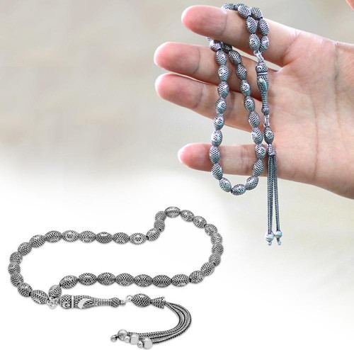 Gümüş Hediye Al Üçlü Kamçı Püsküllü Telkari Tasarım Ayyıldız Detaylı Arpa Kesim Eskitme Renk 925 Ayar Gümüş Tesbih