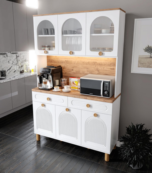 Rosa 140 cm Kahve Köşesi, fonksiyonel tasarımı ve estetik görünümüyle mutfağınıza şıklık katar. Tamamen MDF gövde yapısı ve membran kapakları ile uzun ömürlü kullanım sunar. LED aydınlatmalı yapısı sayesinde kahve makinesi, airfryer ve küçük mutfak gereçleriniz için ideal bir alan oluşturur. Yavaş kapanan kapaklar ve frenli teleskopik raylı çekmeceler ile konforlu kullanım sağlar.