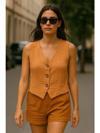Krep kumaş düğmeli yelek bej s3395 - Image 1